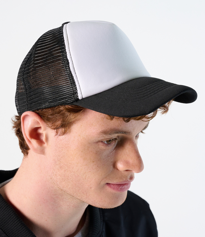 100% polyester. 5 panel.Mesh rear panels.Plastic size adjuster.Suitable for sublimation printing.